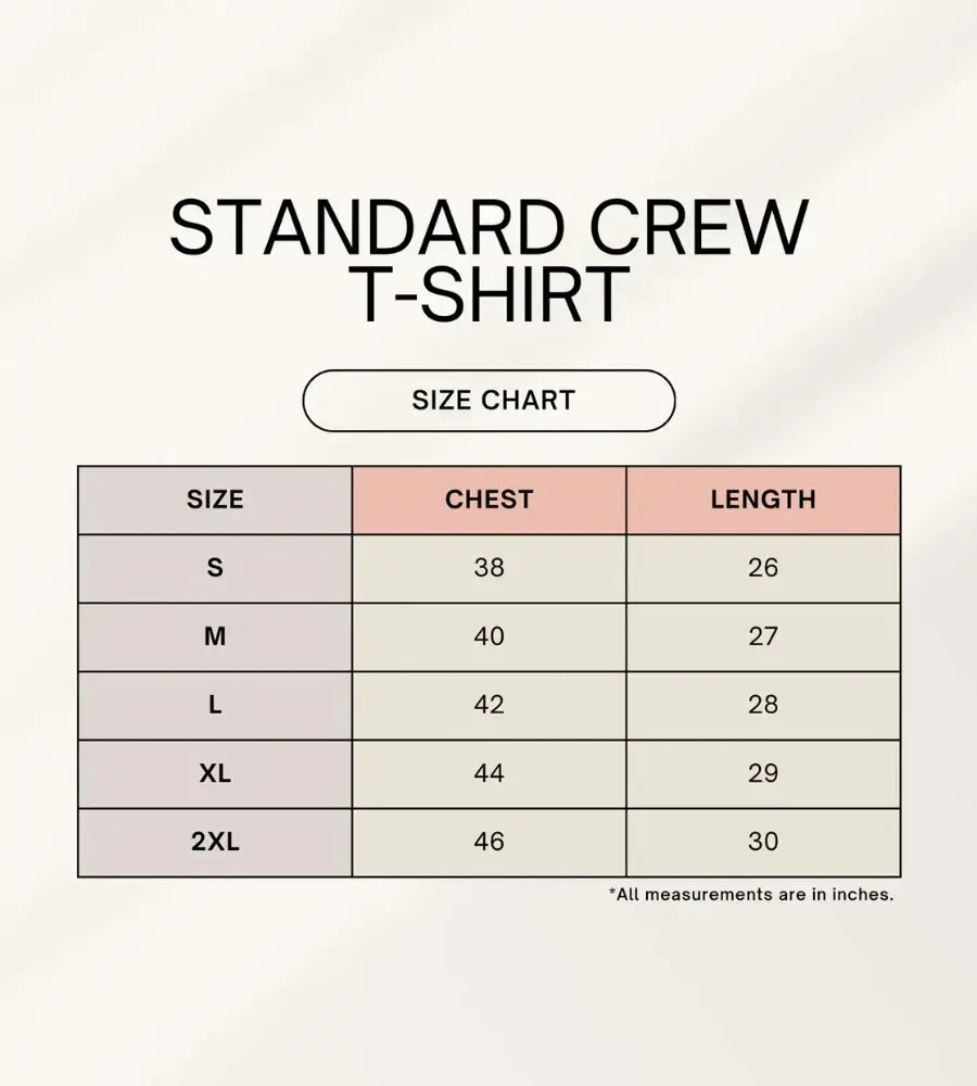 • Fit : Regular unisex fit, standard crew tshirt